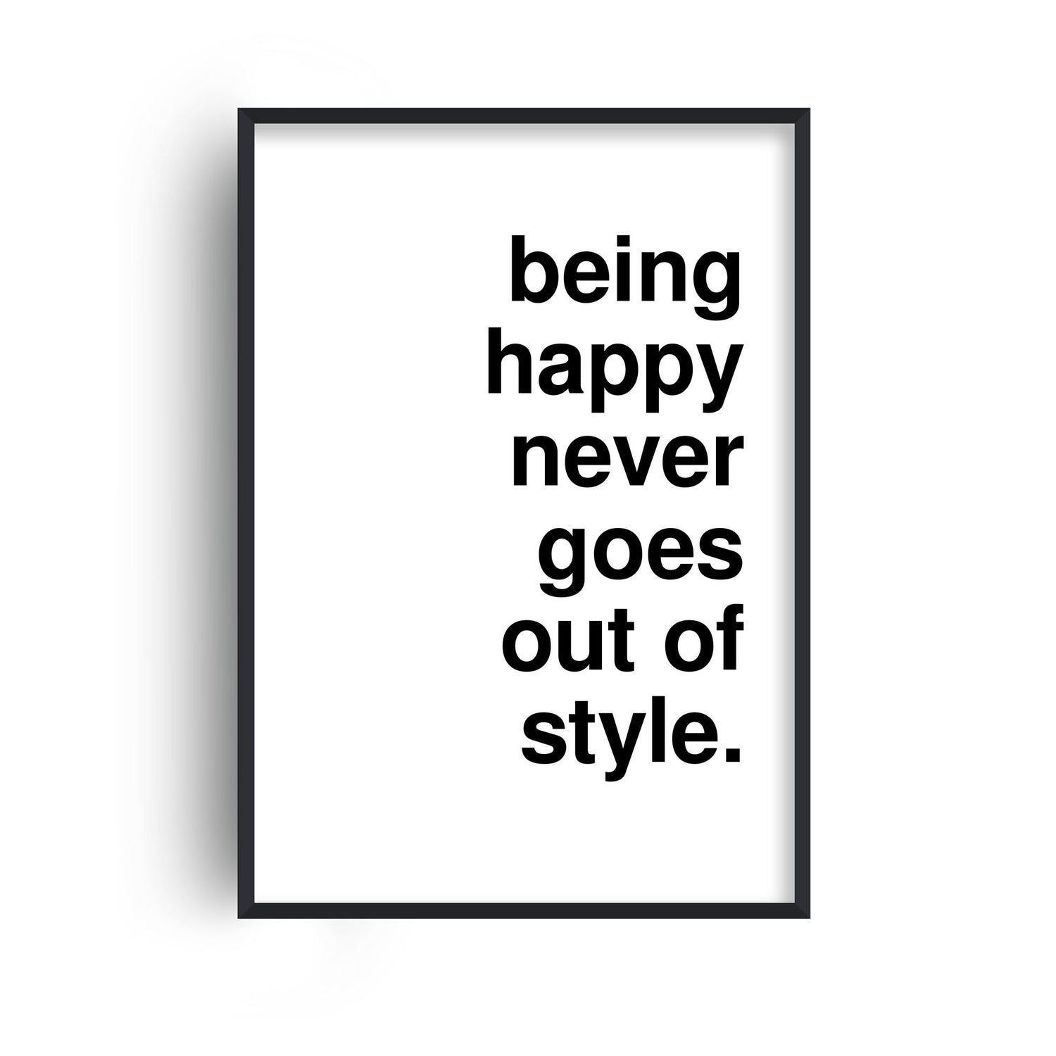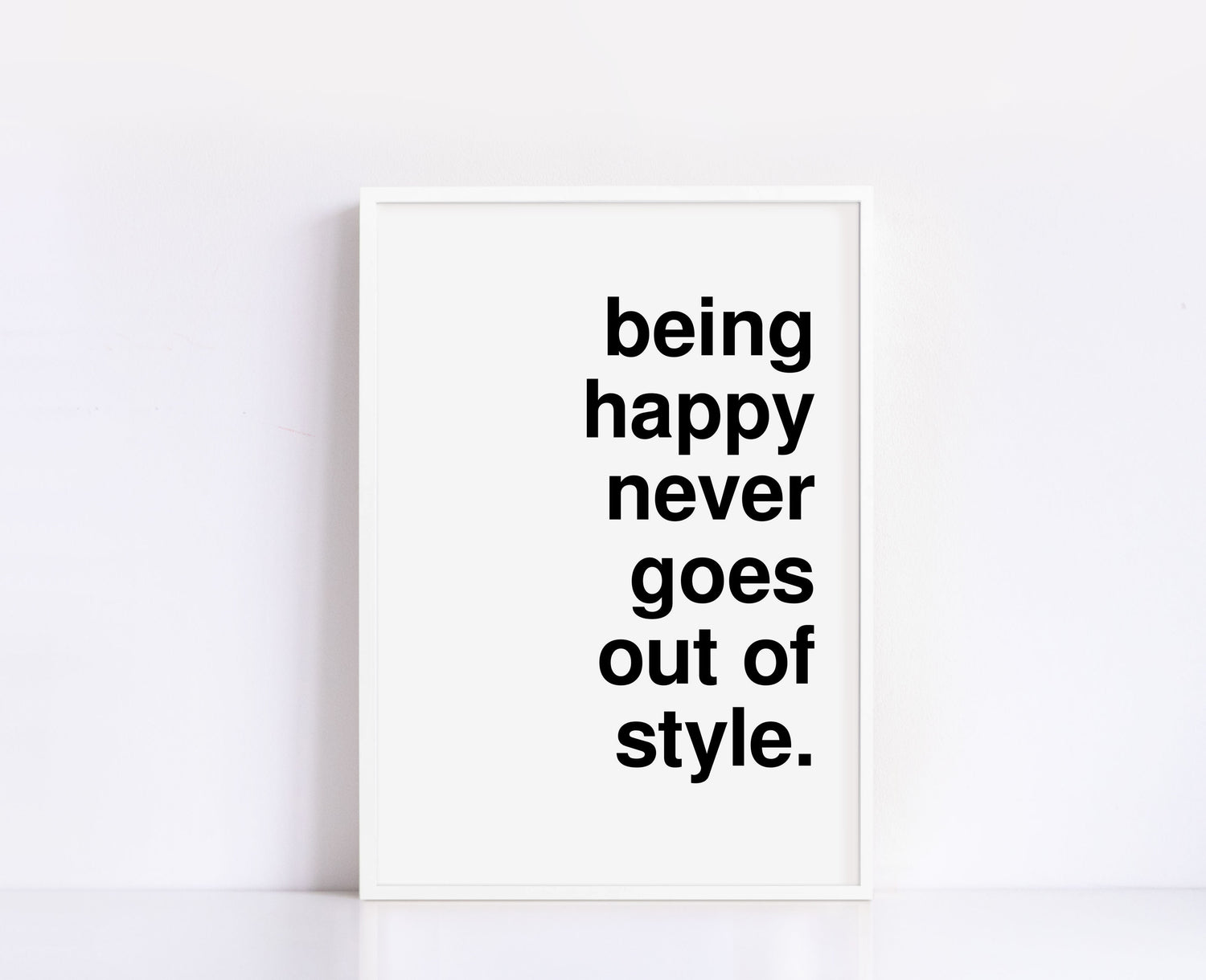 Being happy never goes out of style print. Designed on a clean white background with typography styled in a black.