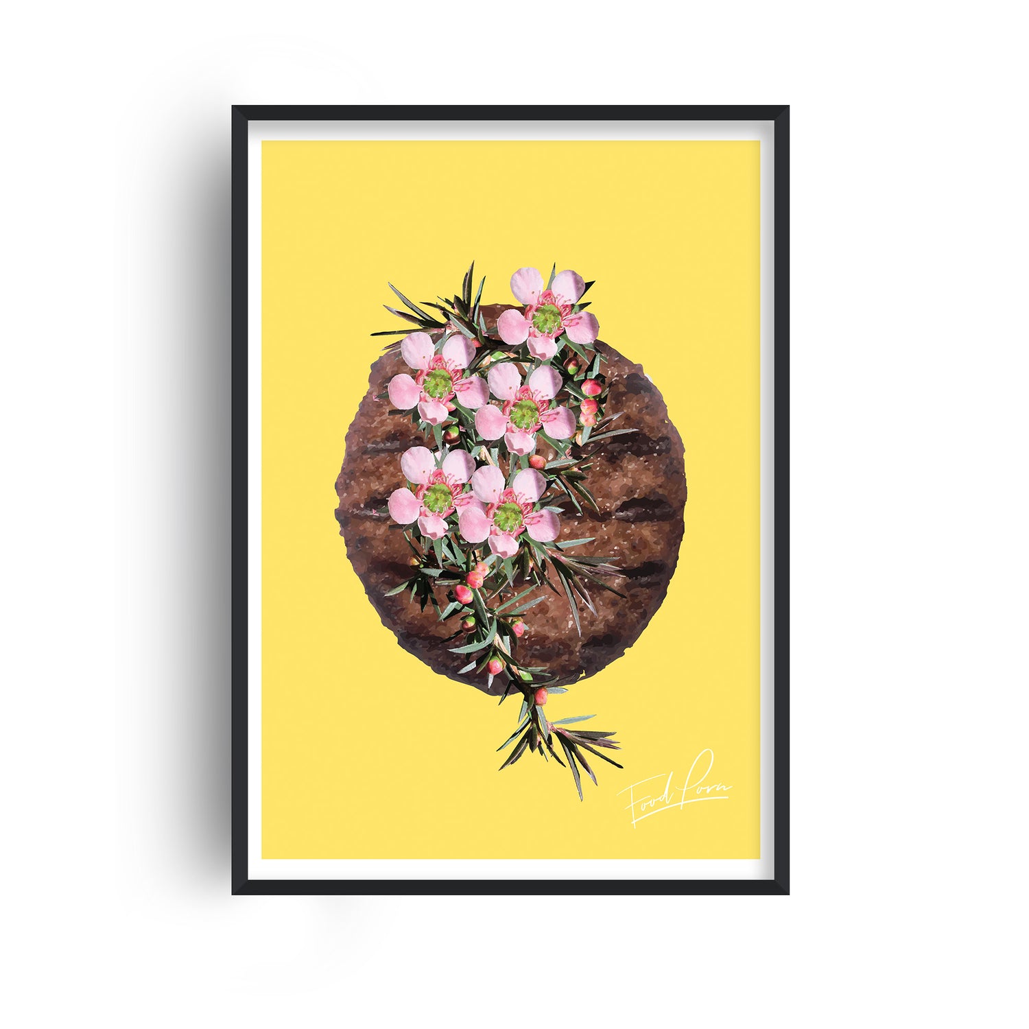 Burger floral print. Designed on a yellow background, with a burger illustration and floral design.