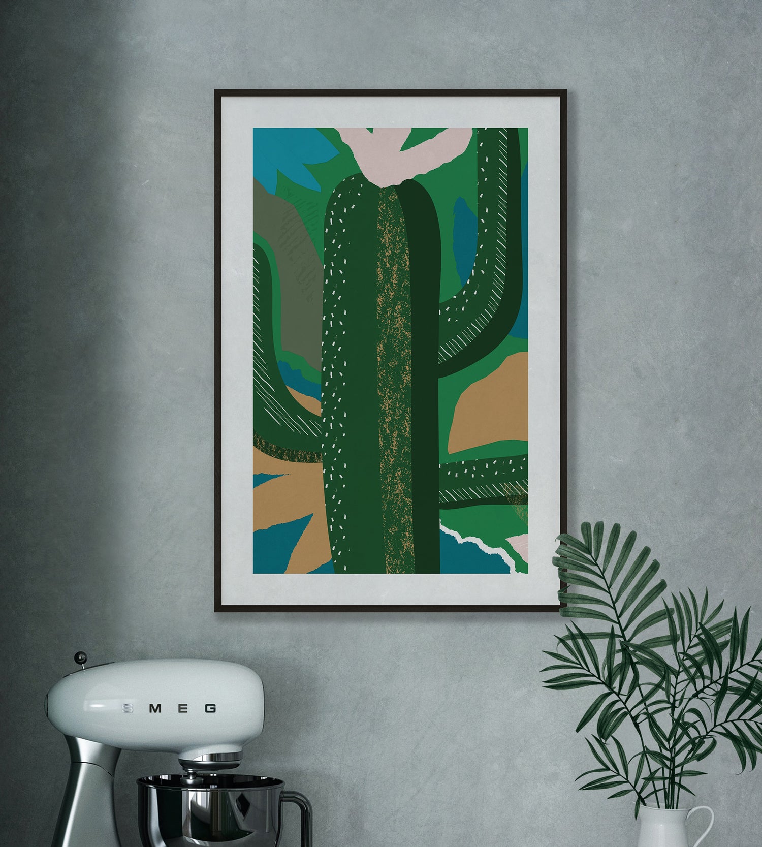 Cactus print from the Jungle collection. Multiple colours in hues of green, grey and blue, with a cactus illustration design in green.