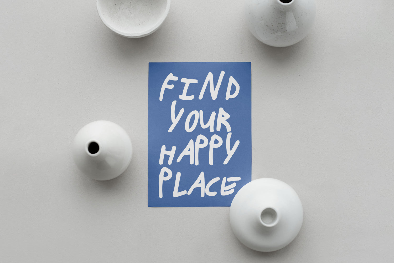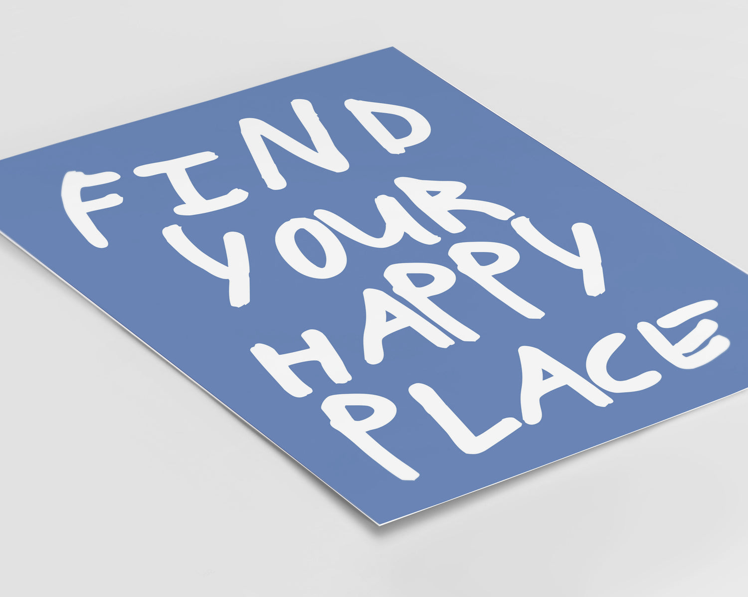 Find your happy print. Designed on a blue background with typography in white.