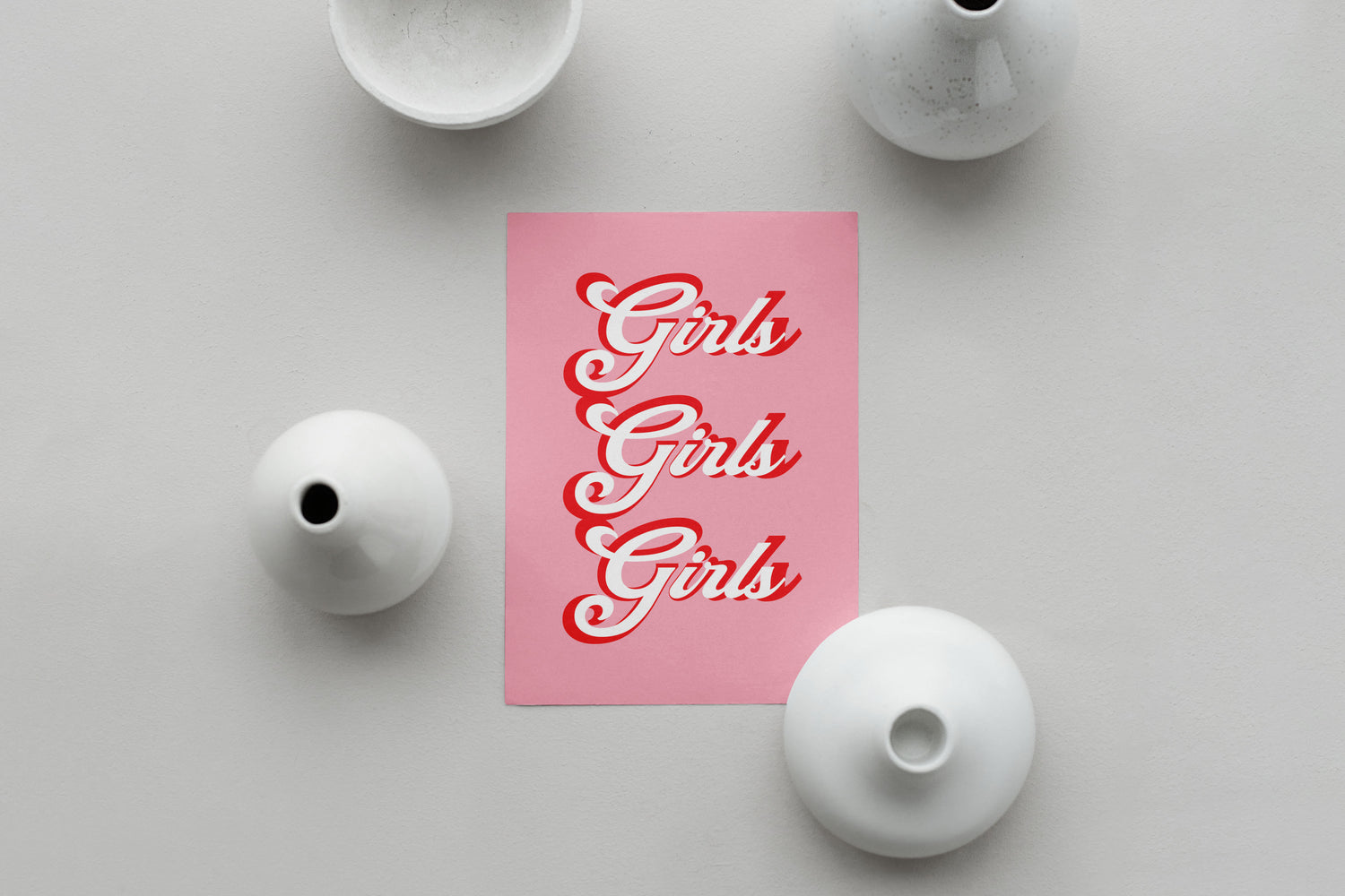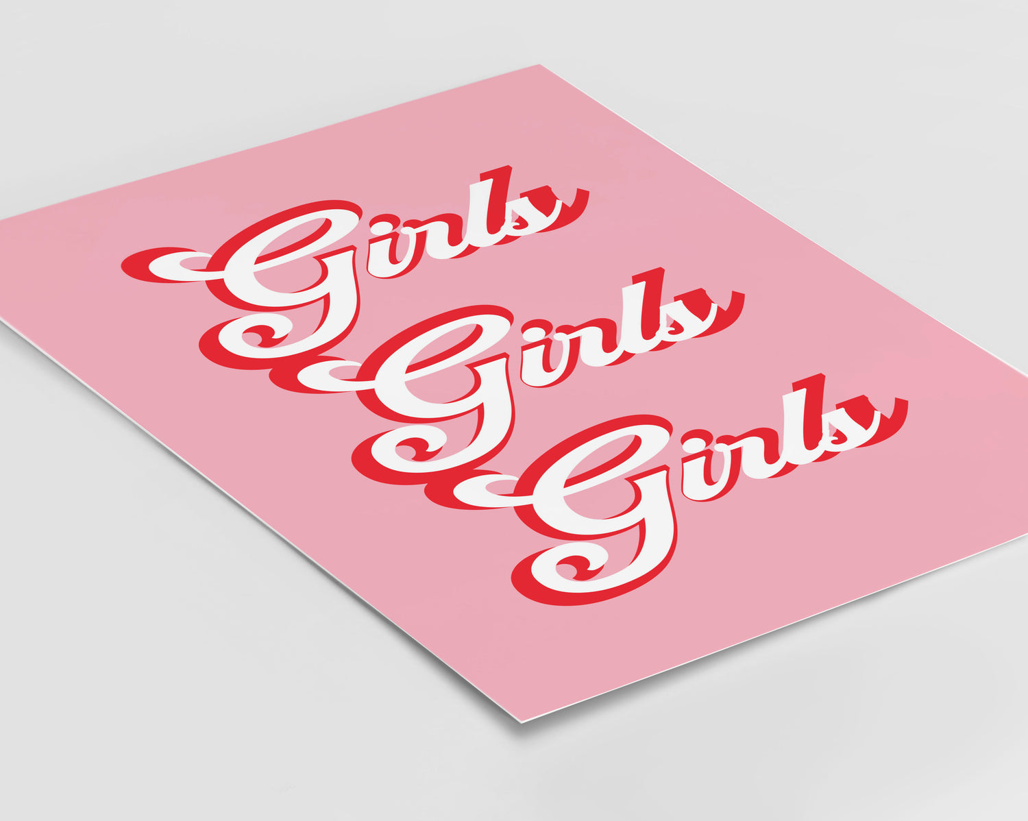 Girls print. Designed on a pink background with typography styled in red and white.