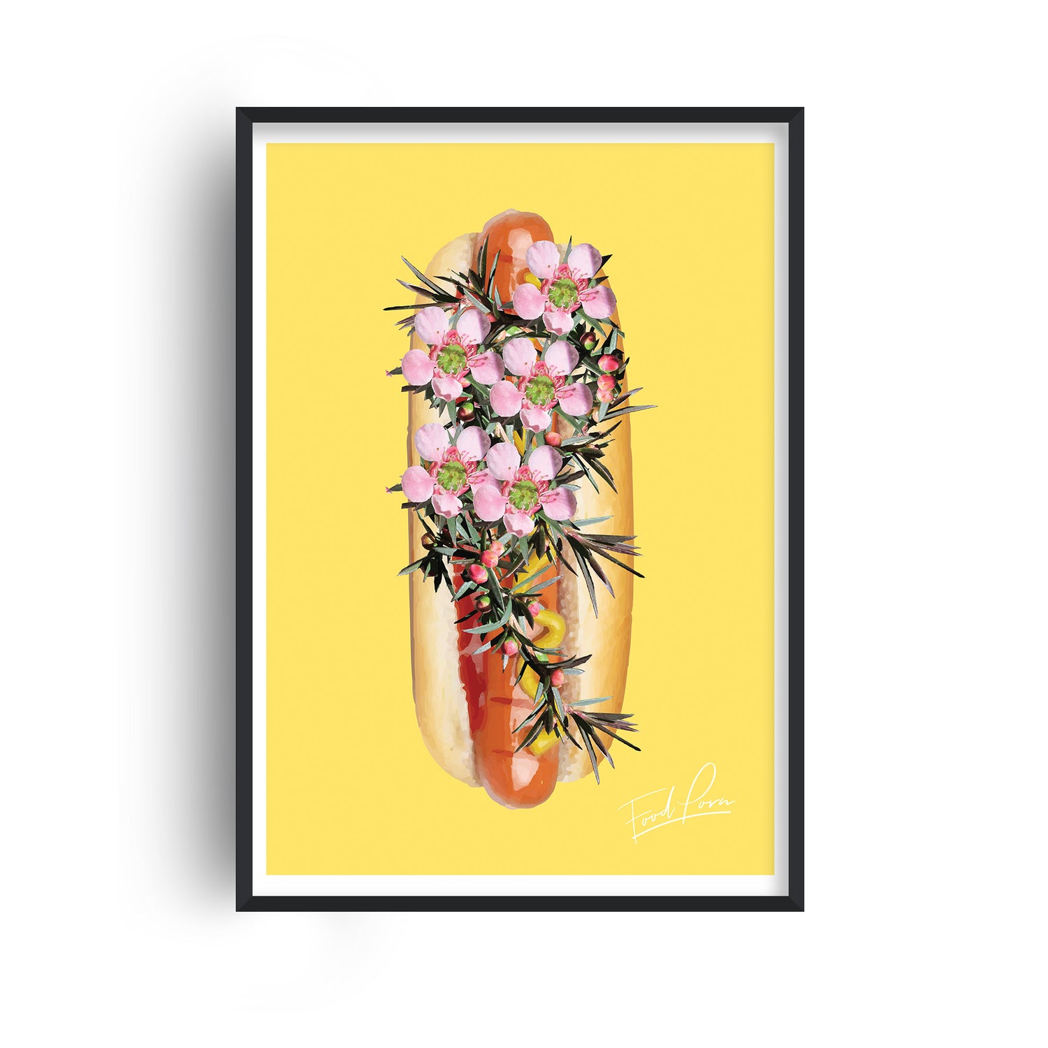 Hot dog floral print. Designed on a yellow background, with a hot dog illustration and floral design.