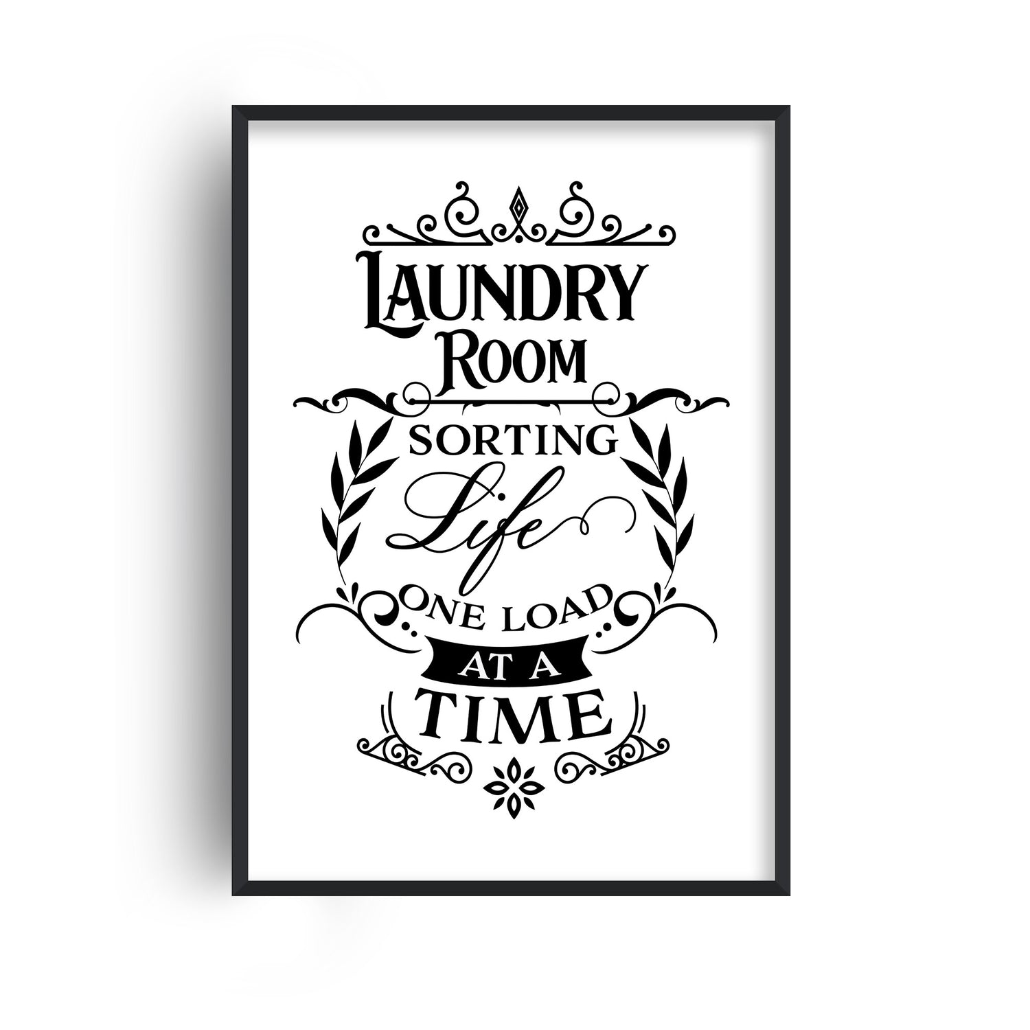 Bathroom print with the quote "Laundry room, sorting life one load at a time". Designed on a clean white background with typography styled in black.
