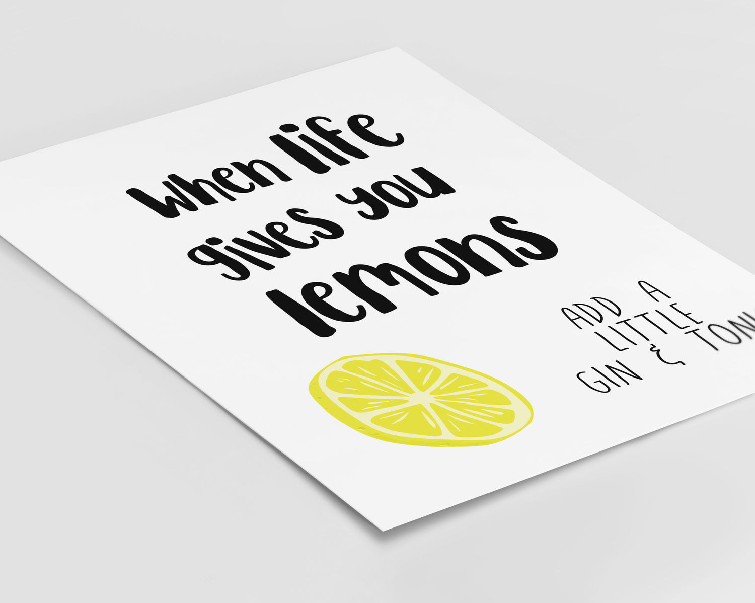 Kitchen print with the quote "when life gives you lemons, add a little gin and tonic". Designed on a clean white background with typography styled in black.