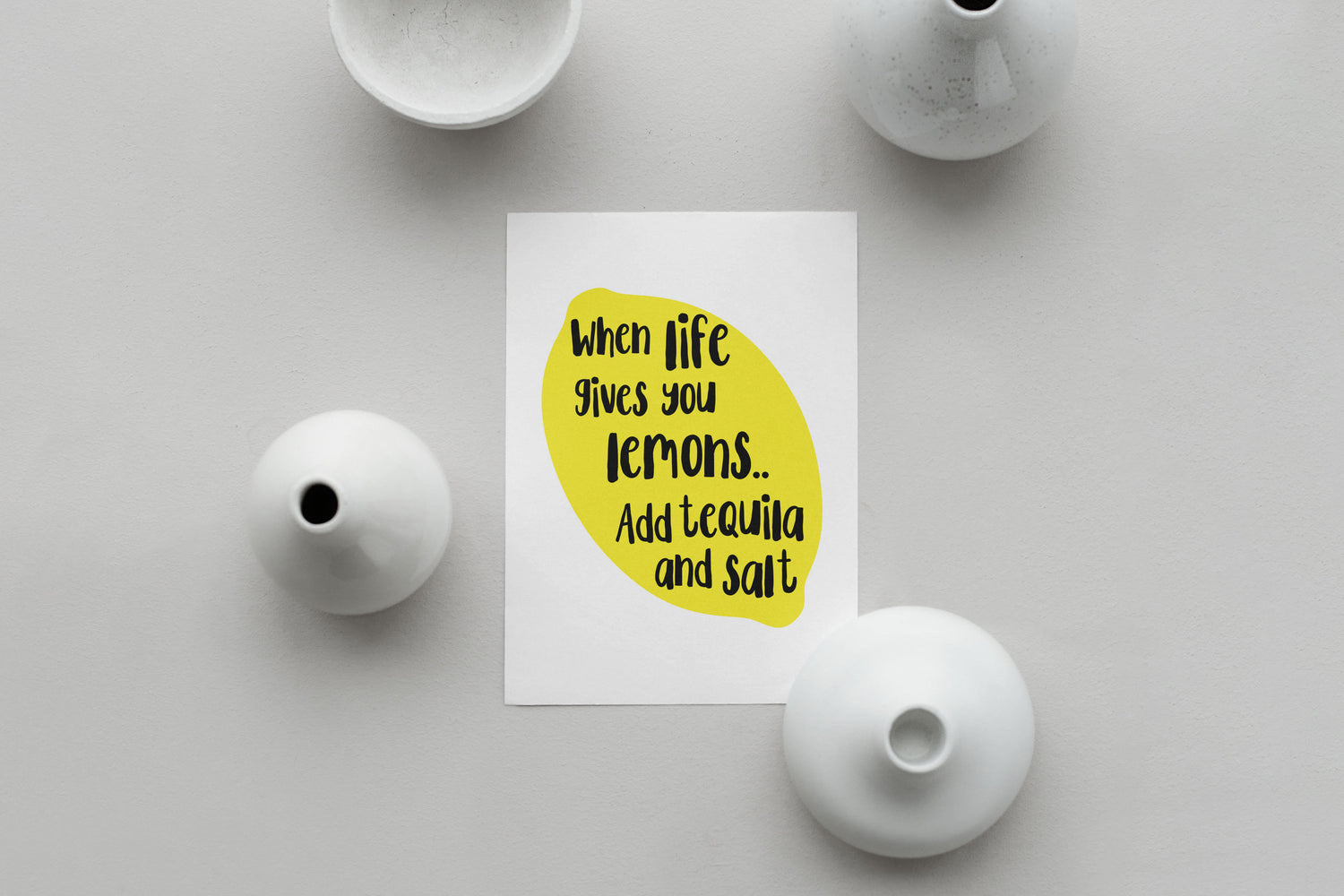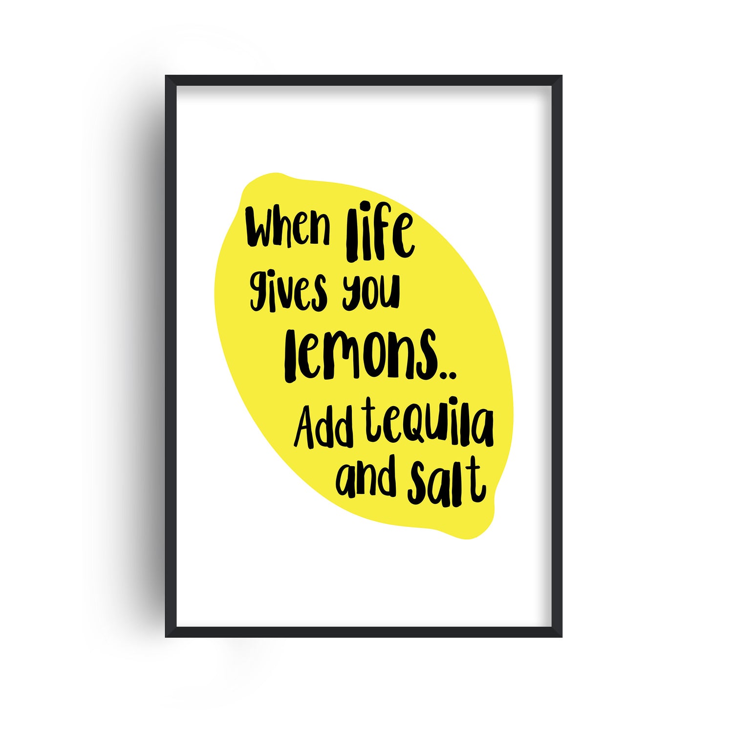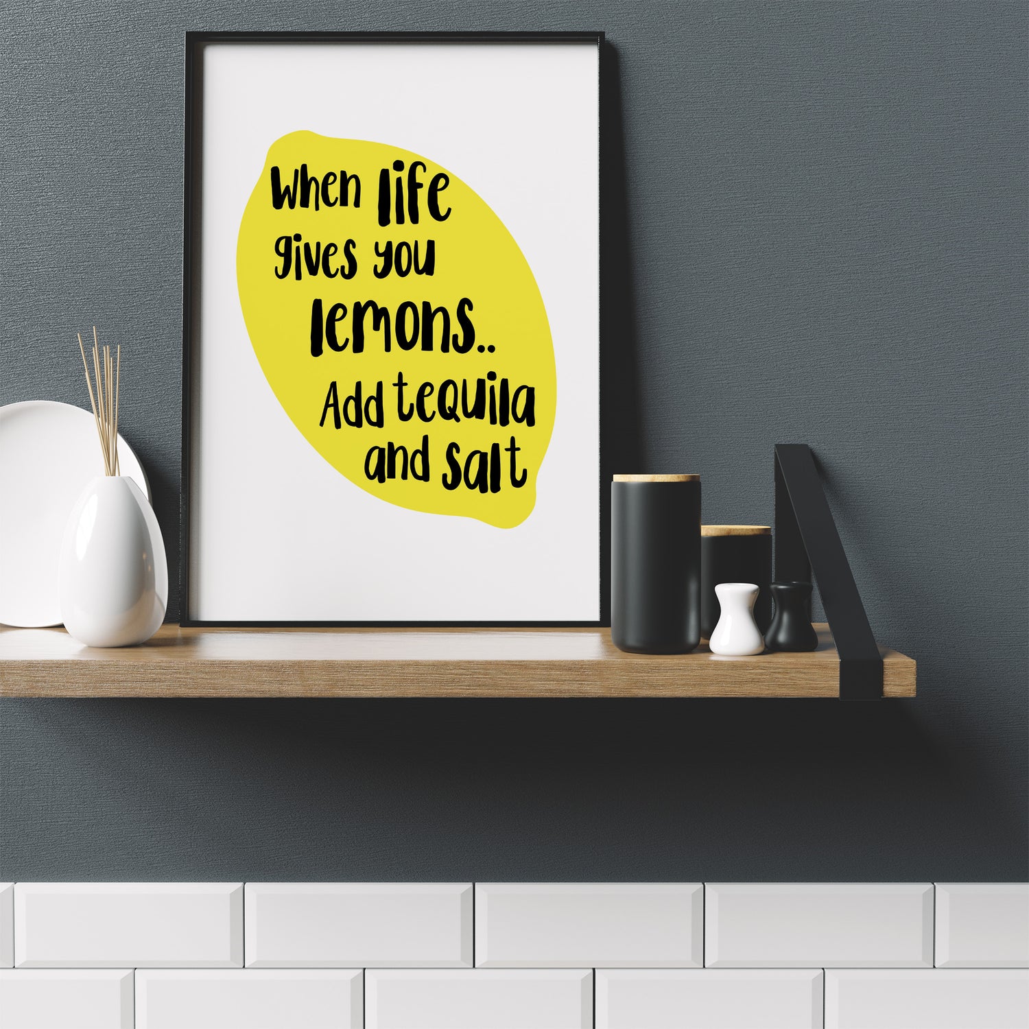 Kitchen print with the quote "when life gives you lemons, add tequila and salt". Designed on a clean white background with typography styled in black.