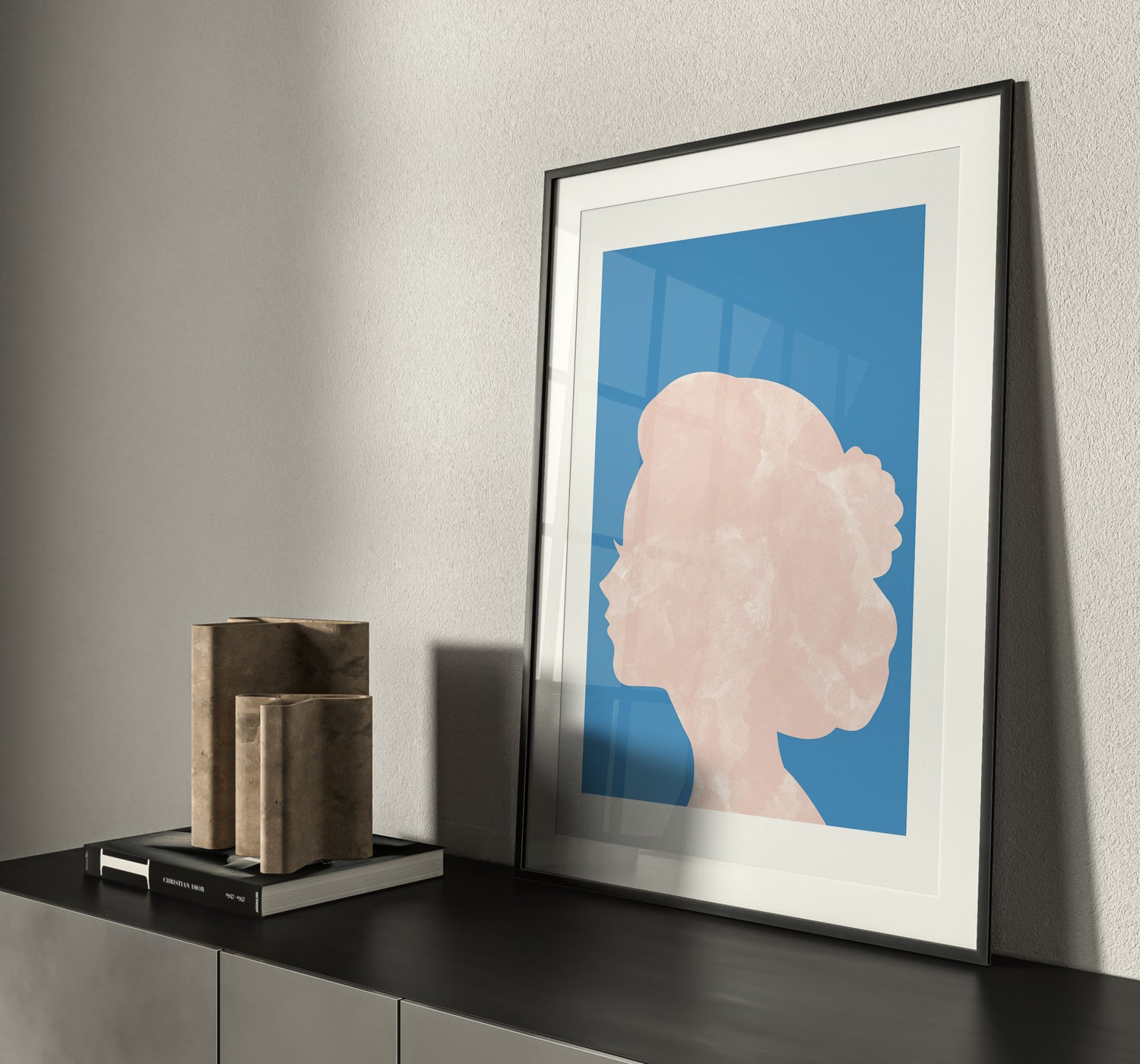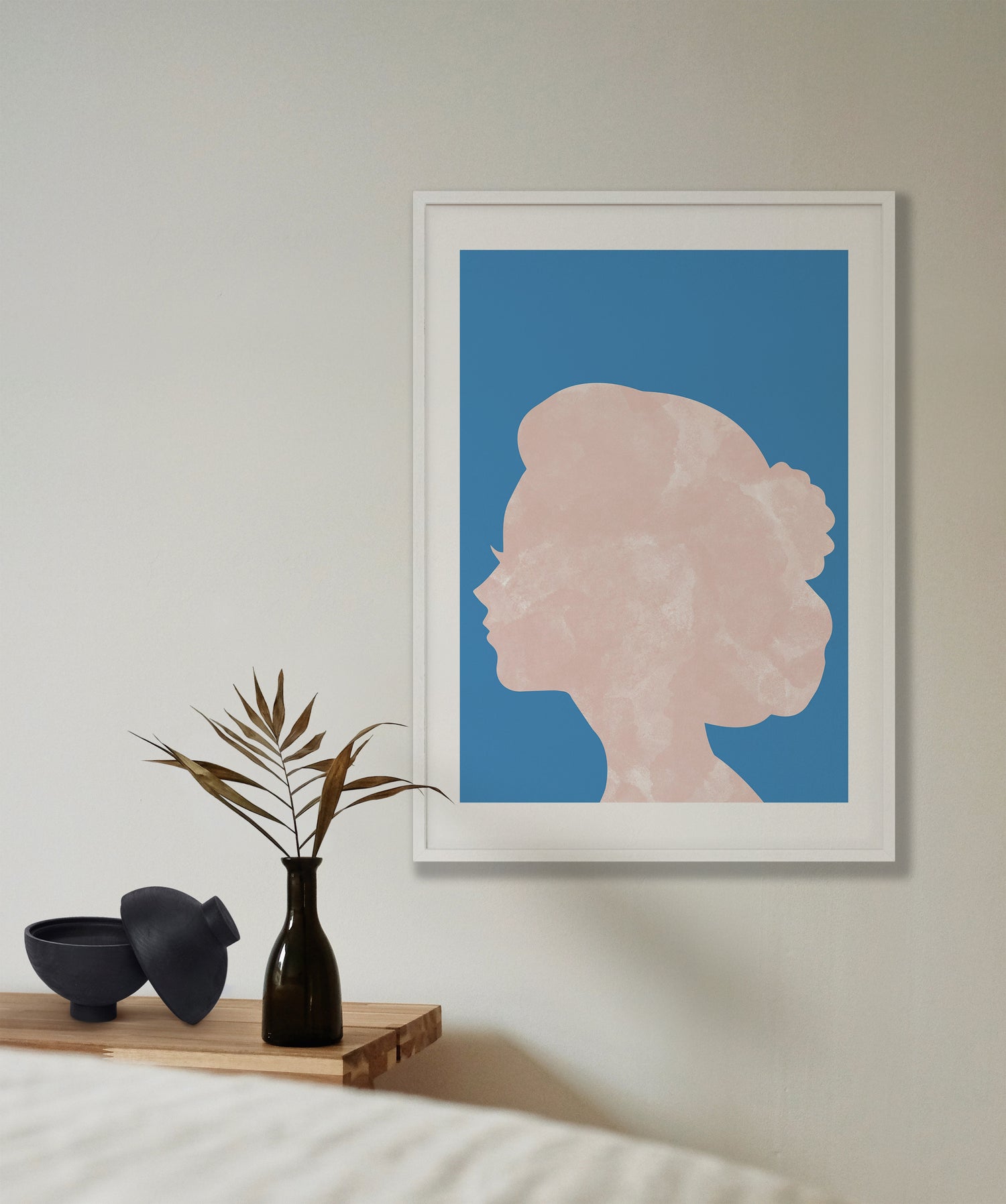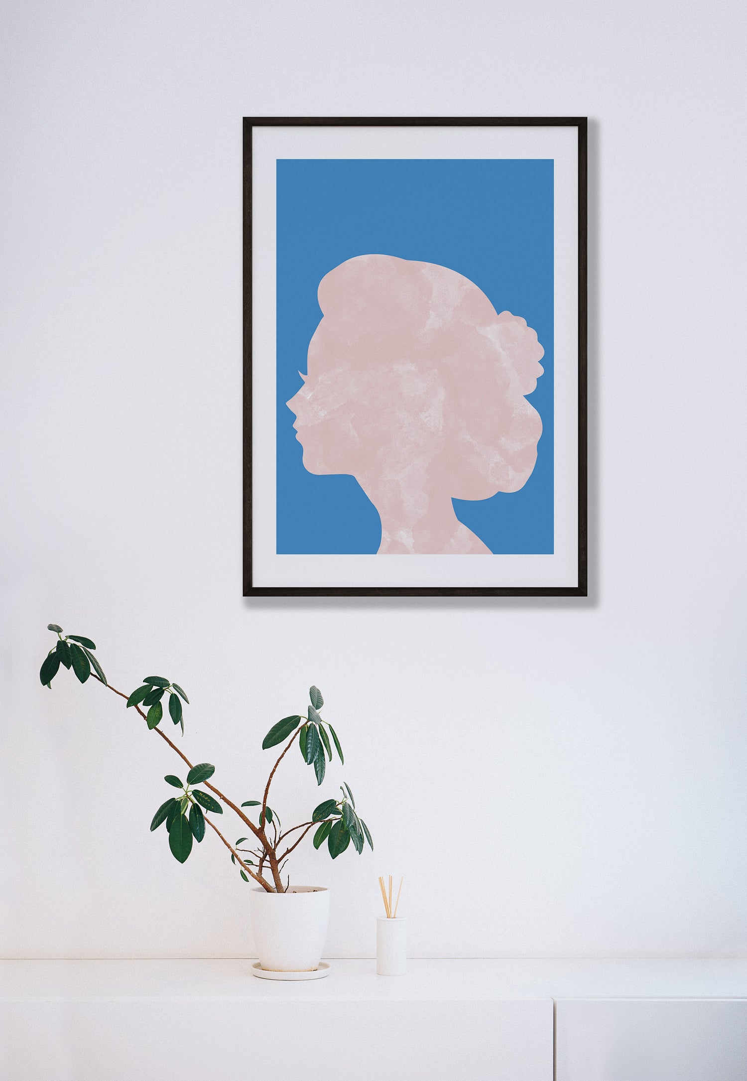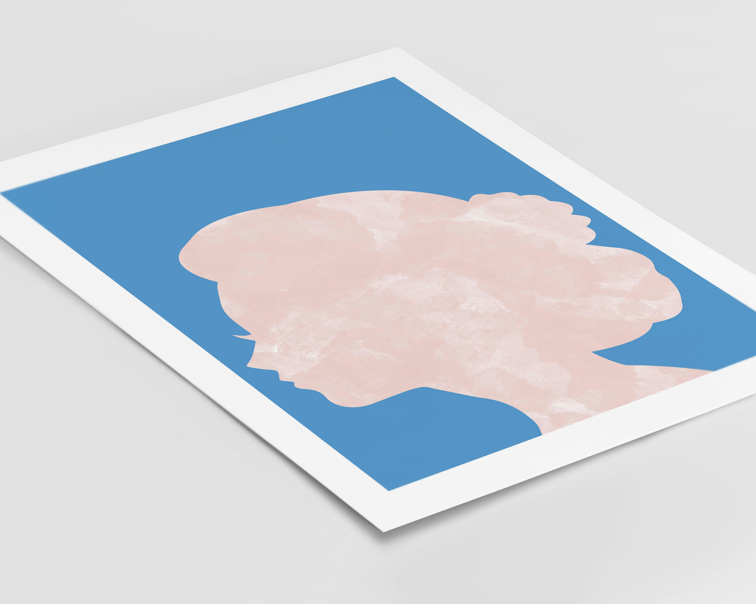 Marble head print. Designed on a bold blue background with a head silhouette in a marble pink design.