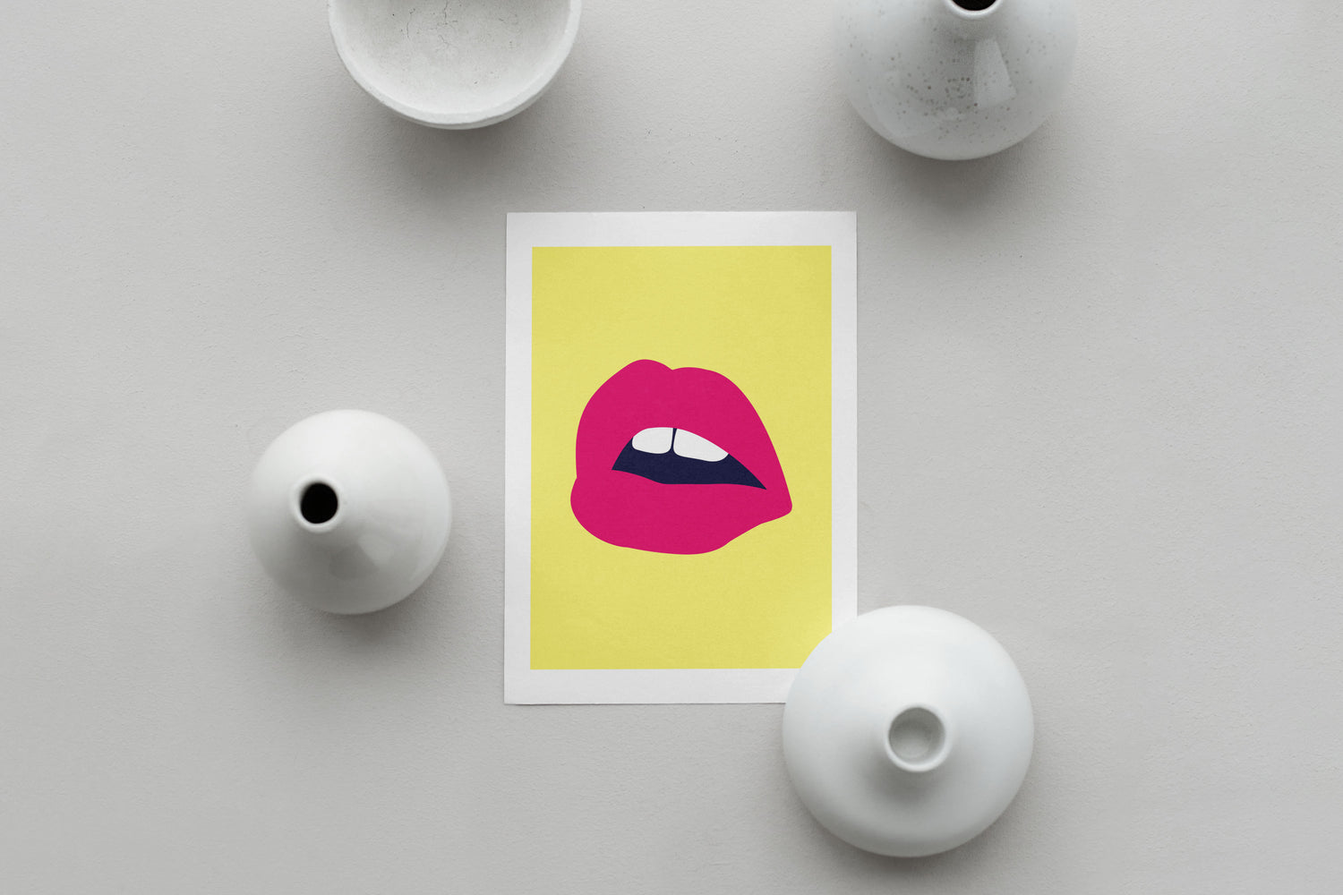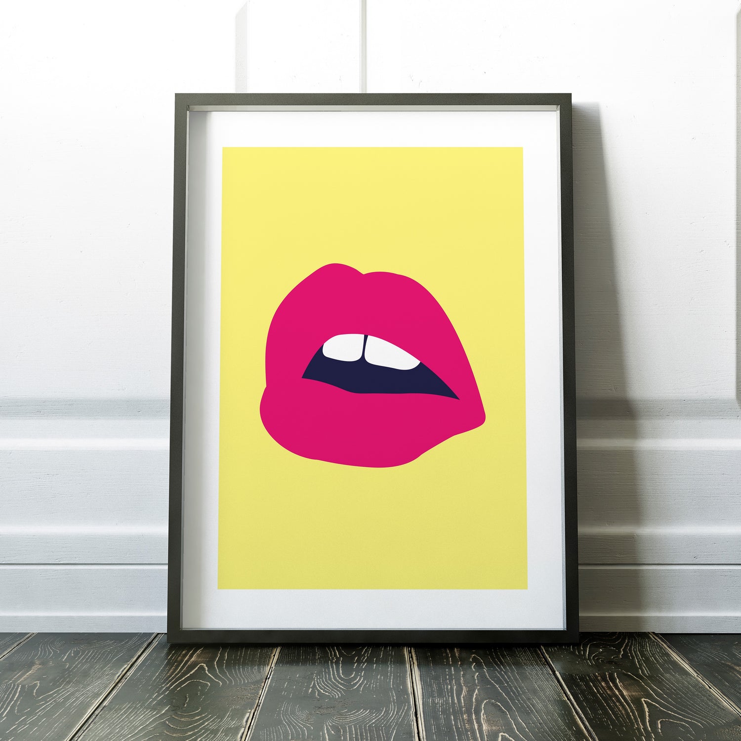 Pink lips print. Designed on a white and yellow background, with a bold lip design.