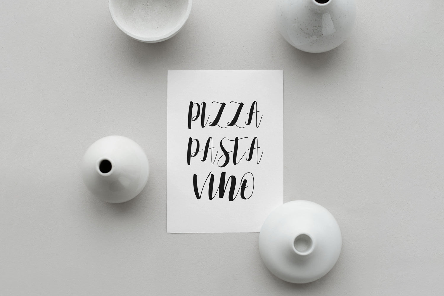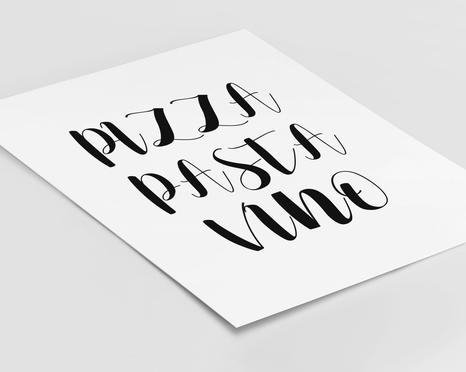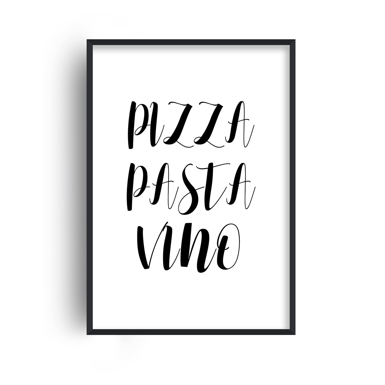 Kitchen print with the quote "pizza pasta vino". Designed on a clean white background with typography styled in black.