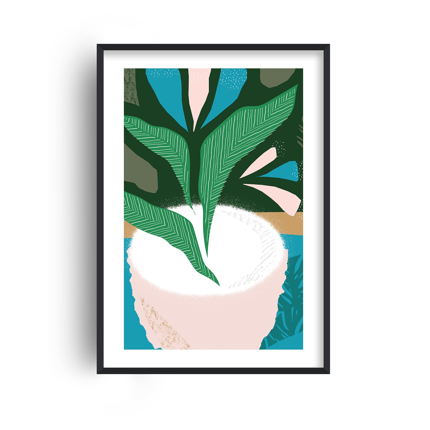 Plant pot print from the Jungle collection. Multiple colours in hues of green, grey and blue, with a plant illustration design in green and pink.