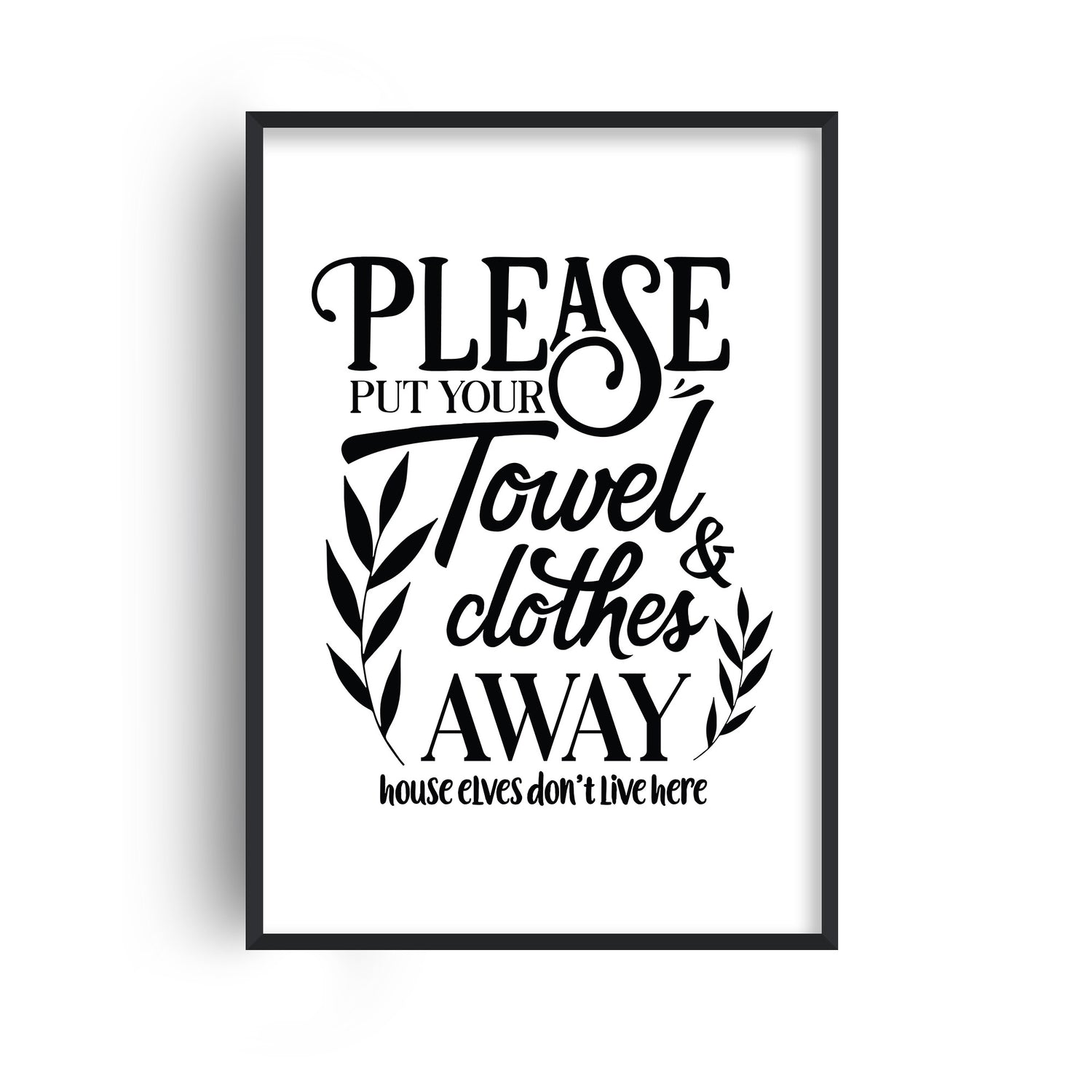 Bathroom print with the quote "Please put your towel and clothes away. House elves don't live here". Designed on a clean white background with typography styled in black.
