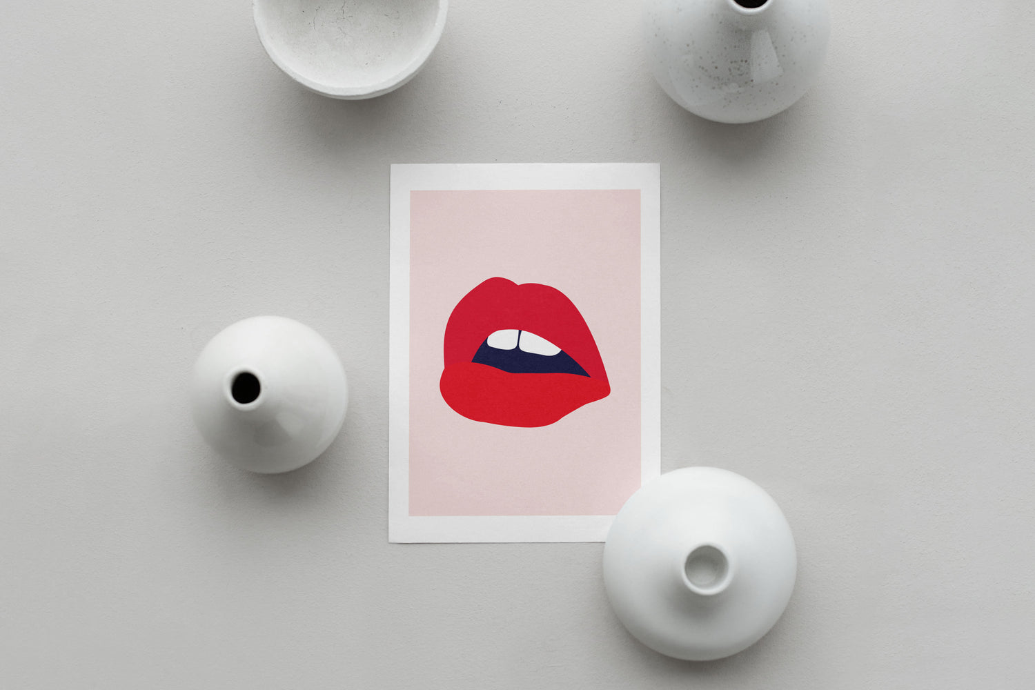 Red lips print. Designed on a white and salmon pink background, with a bold lip design.