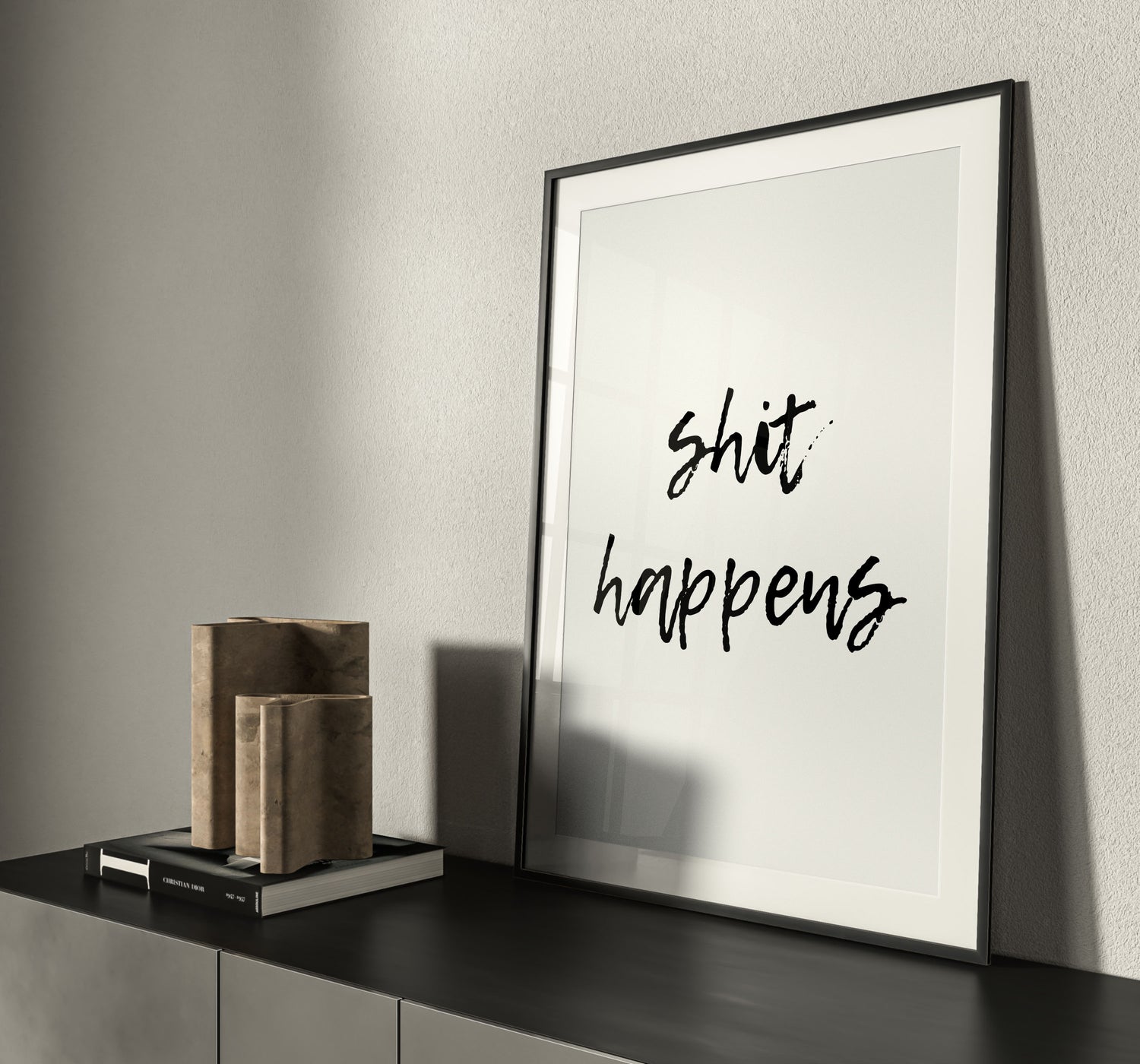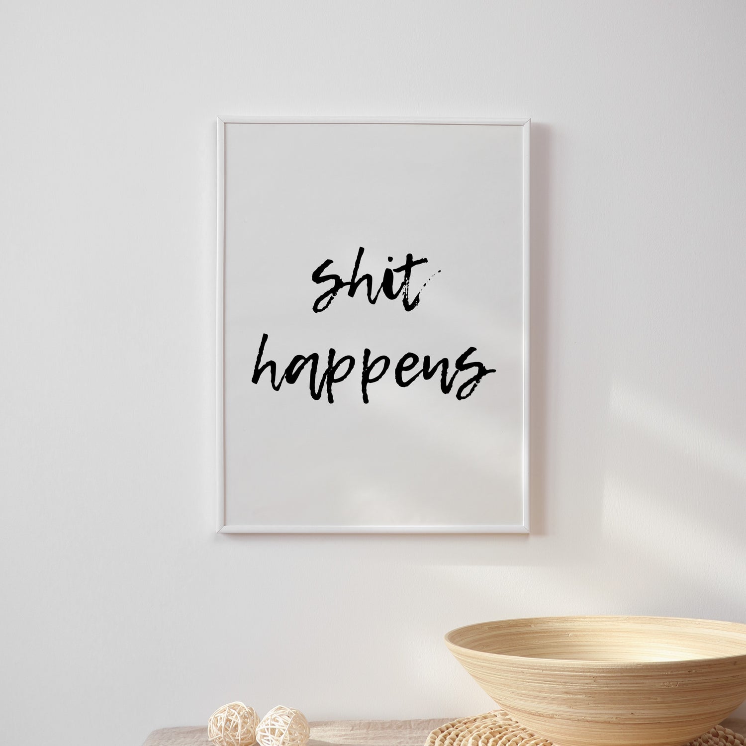 Sh*t happens bathroom print. Designed on a clean white background with typography styled in black.