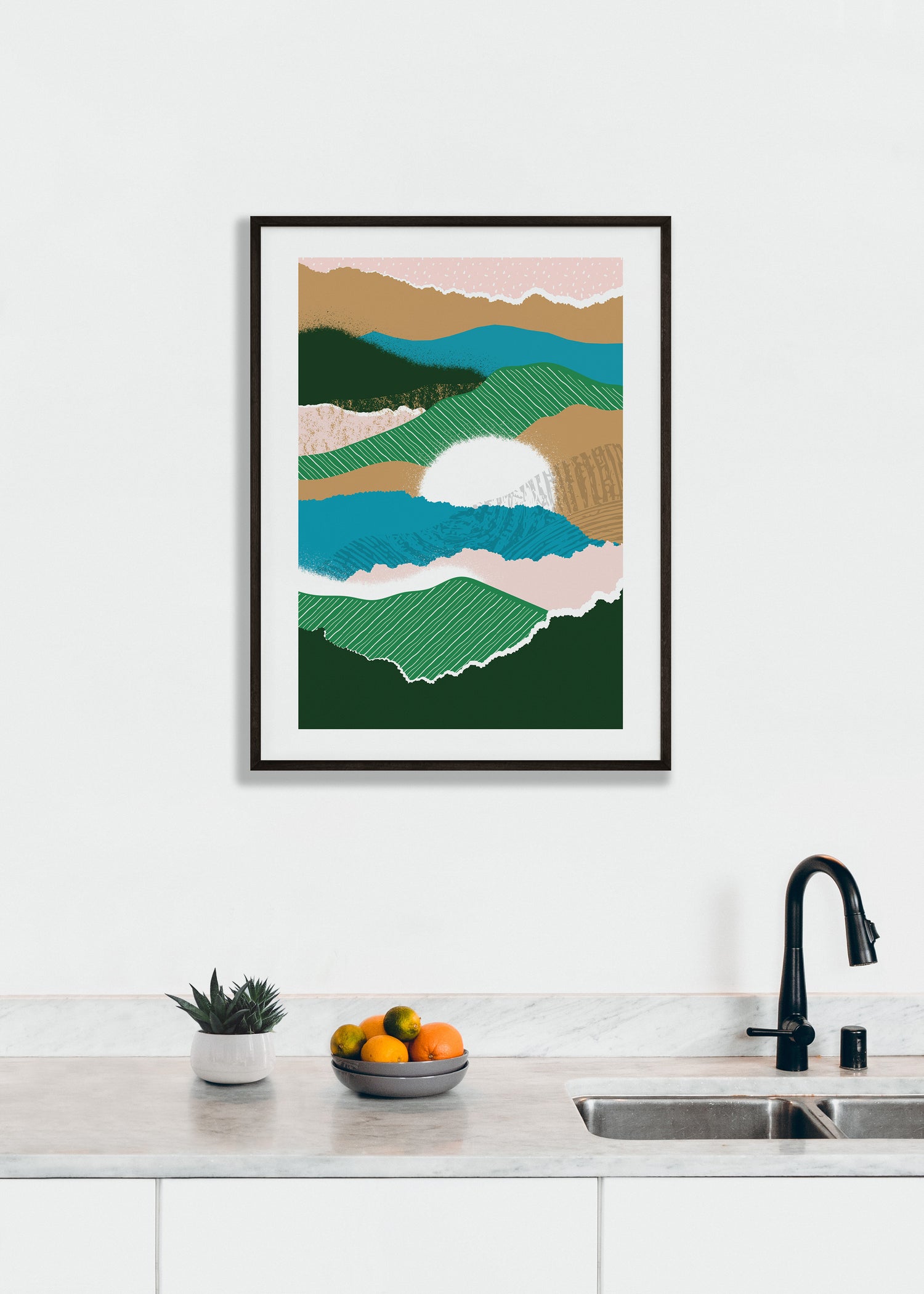 Sunrise print from the Jungle collection. Multiple colours in hues of green, pink and blue, with a sun rise illustration design.