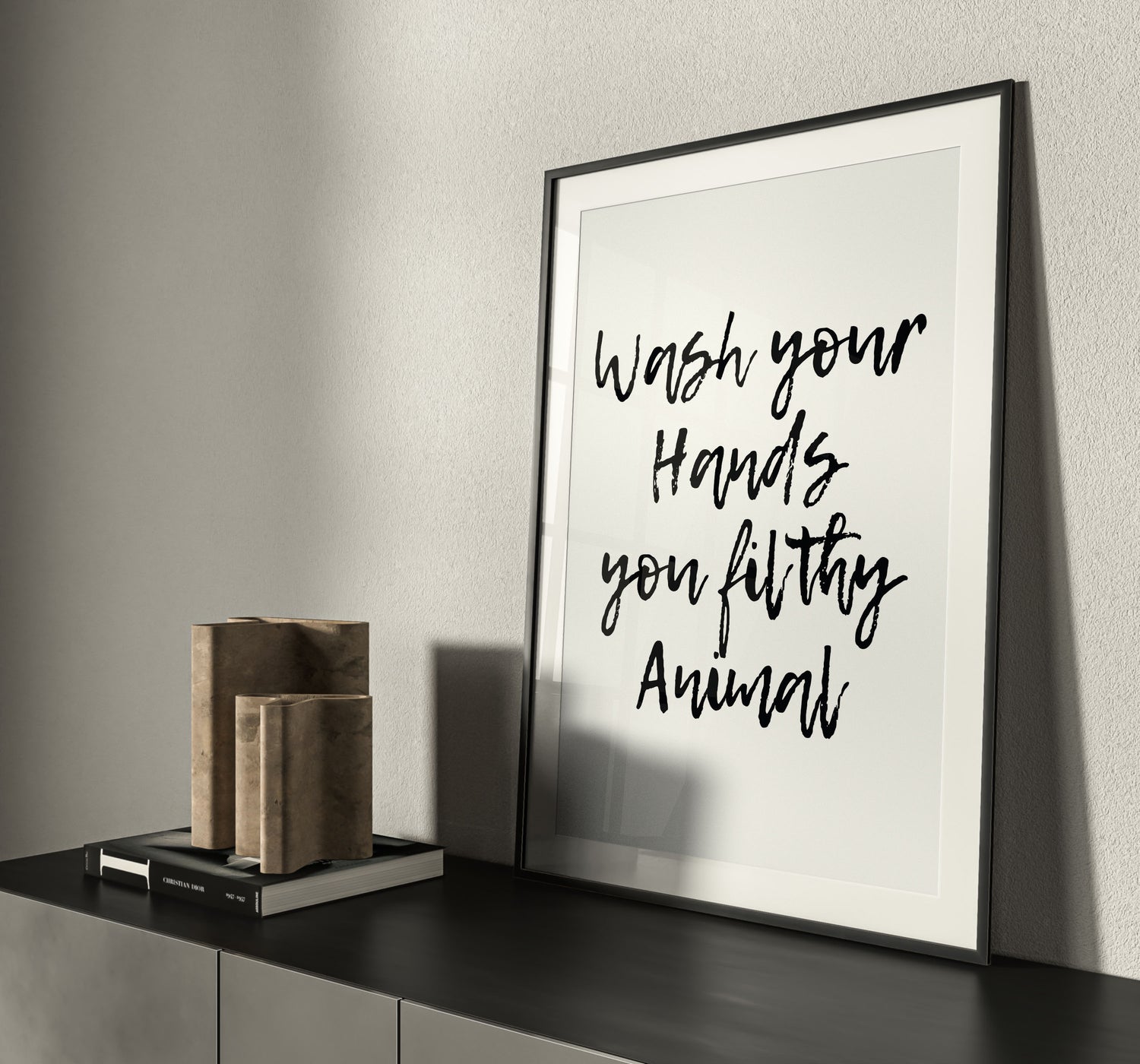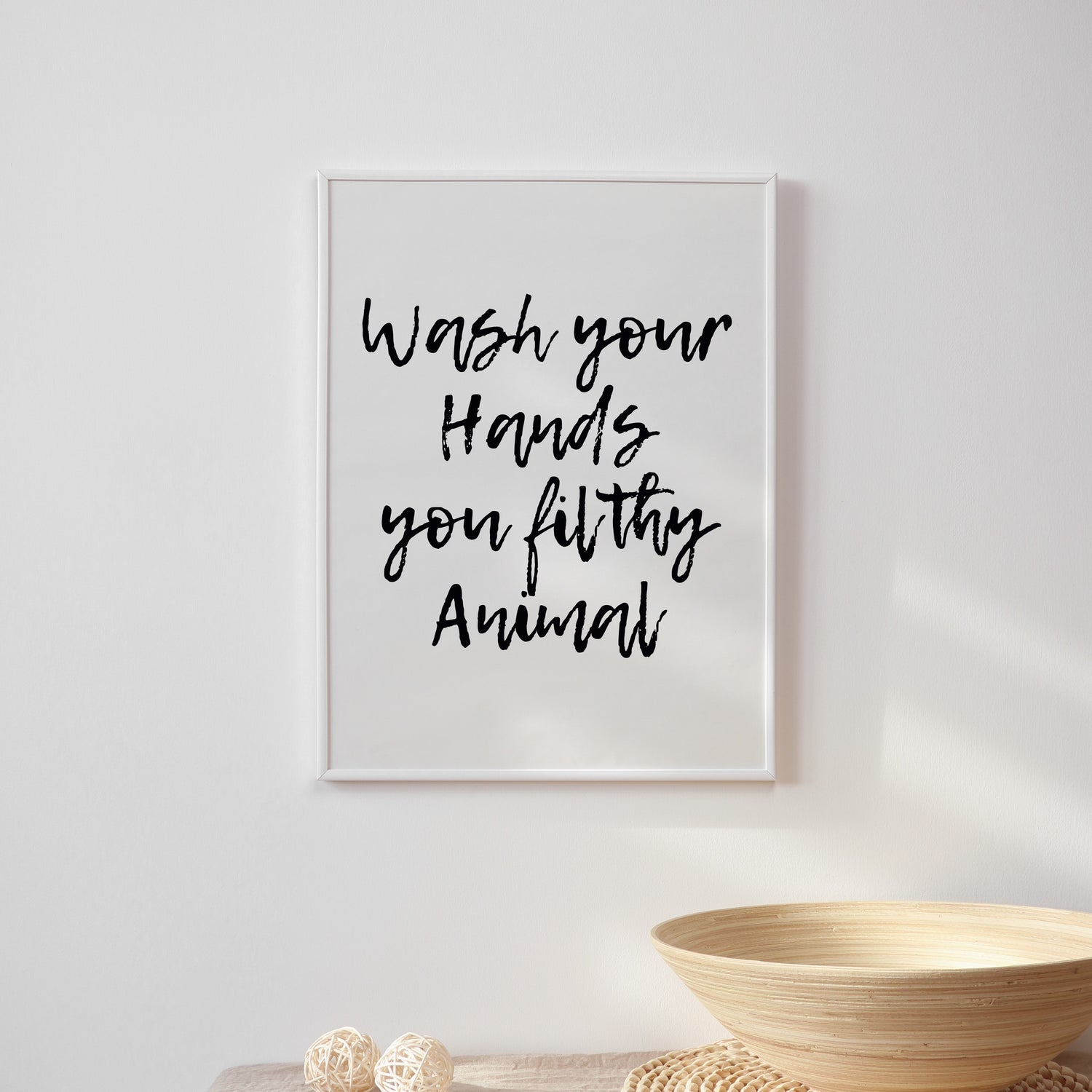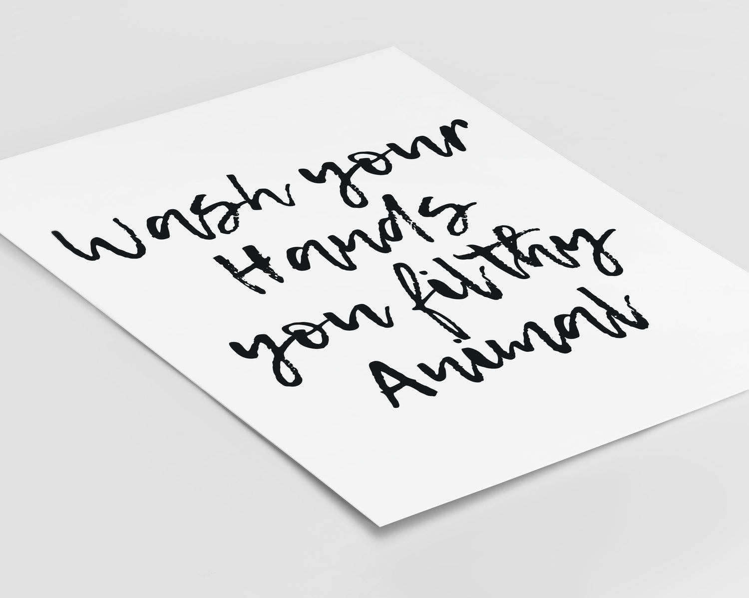 Wash your hands you filthy animal print. Designed on a clean white background with typography styled in black.