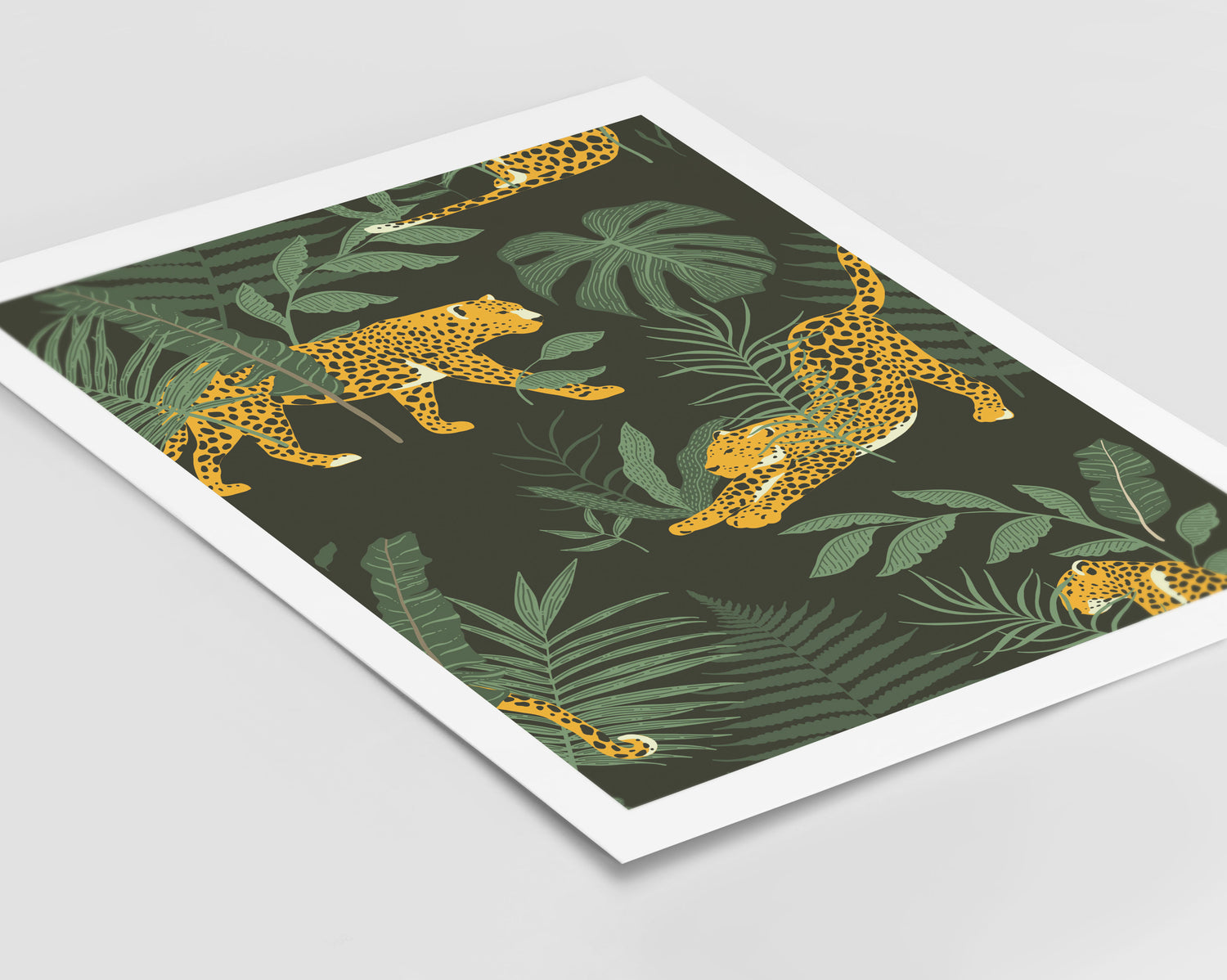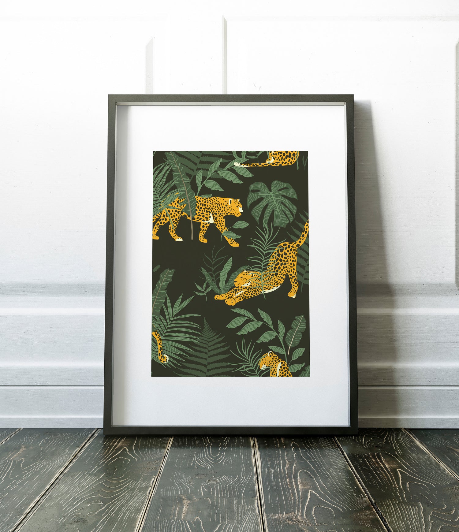 An elegant home wall art print from the Wild Collection. A wild cheetah with green foliage on a deep green background.
